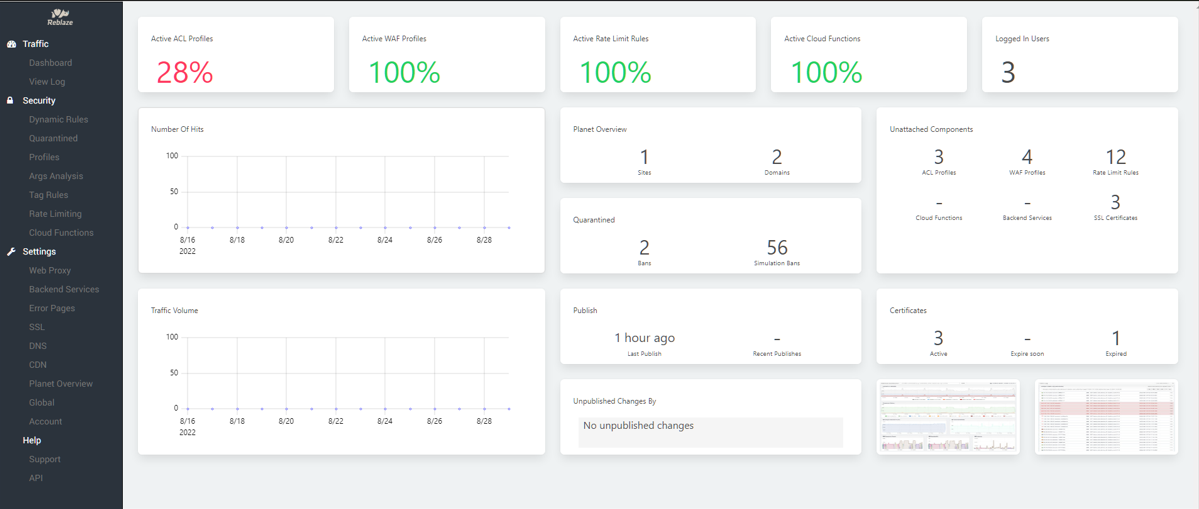 <table data-header-hidden><thead><tr><th width="196">Component Name</th><th>Description</th></tr></thead><tbody><tr><td><strong>Active ACL Profiles</strong></td><td><p>Shows the percentage of ACL profiles currently active in your planet. </p><p>Click on the component name to access its screen in the console.</p></td></tr><tr><td><strong>Active WAF Profiles</strong></td><td><p>Shows the percentage WAF profiles currently active. </p><p>Click on the component name to access its screen in the console.</p></td></tr><tr><td><strong>Active Rate Limit Rules</strong></td><td><p>Shows the percentage of Rate Limit rules active. </p><p>Click on the component name to access its screen in the console.</p></td></tr><tr><td><strong>Active Cloud Functions</strong></td><td><p>Shows the percentage of active Cloud Functions. </p><p>Click on the component name to access its screen in the console.</p></td></tr><tr><td><strong>Logged In Users</strong></td><td>Shows the number of users logged into the Reblaze console within the past 24 hours and who have not logged out.</td></tr><tr><td><strong>Number of Hits</strong></td><td>Displays the number of requests handled during the past 14 days and the number of requests per day.</td></tr><tr><td><strong>Traffic Volume</strong></td><td>Shows the amount of traffic per day for the last 14 days.</td></tr><tr><td><strong>Planet Overview</strong></td><td><p>Displays the number of sites defined in your planet and the number of domains in each site. </p><p>Click on the component name to access its screen in the console.</p></td></tr><tr><td><strong>Quarantined</strong></td><td><p>Shows the number of IP addresses on the Banlist and the number of IP addresses on the Simulation Banlist. </p><p>Click on the component name to access its screen in the console.</p></td></tr><tr><td><strong>Publish</strong></td><td>Shows the time the last configuration changes were saved and published; in <em>Recent Publishes</em> the number of changes published within the last 30 minutes is displayed.</td></tr><tr><td><strong>Unpublished Changes By</strong></td><td>Informs and alerts the user that the person whose name appears is logged into the console and is working on changes. To avoid conflicting changes, the user is advised to coordinate any changes with the other user(s) named. </td></tr><tr><td><strong>Unattached Components</strong></td><td>This section lists services in your planet and the number of profiles per service not associated with or used by any site.</td></tr><tr><td><strong>Certificates</strong></td><td><p>Refers to the number of active SSL certificates in the system for Load Balancers and in the Certificate Store. <em>Expire soon</em> displays the number of certificates set to expire within the next two weeks; <em>Expired</em> shows the number of expired certificates, which generally should be deleted from the system. </p><p>Click on the component name to access the SSL Management screen in the console. </p></td></tr></tbody></table>
