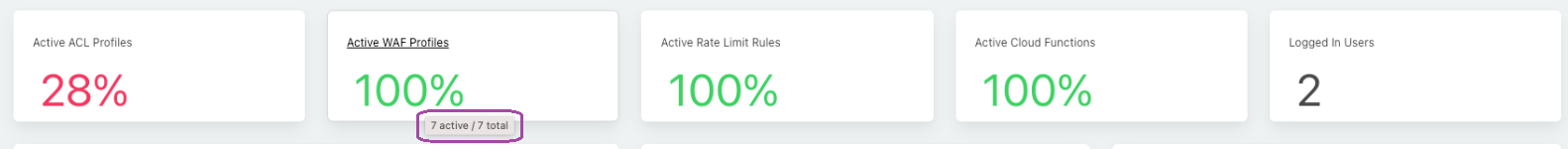 **Hovering** over each of the four services in the top row of the landing page reveals the number of active profiles per service. For example, below, hovering over *Active WAF Profiles* shows that 7 out of 7 profiles are active.&#x20;