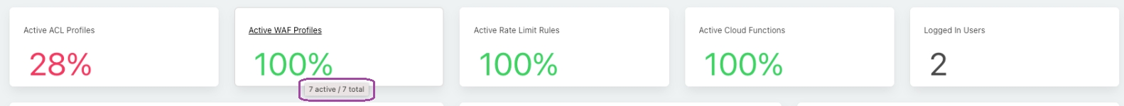 Hovering over each of the four services in the top row of the landing page reveals the number of active profiles per service. For example, below, hovering over Active WAF Profiles shows that 7 out of 7 profiles are active.