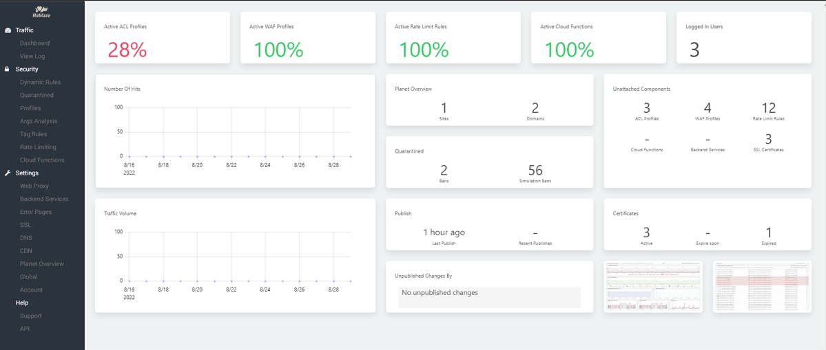 When logging into the Reblaze console, the first screen you see is the landing page which provides you with an - at a glance - overview of protection status and activity in 13 components of your planet, as seen in the landing page here.