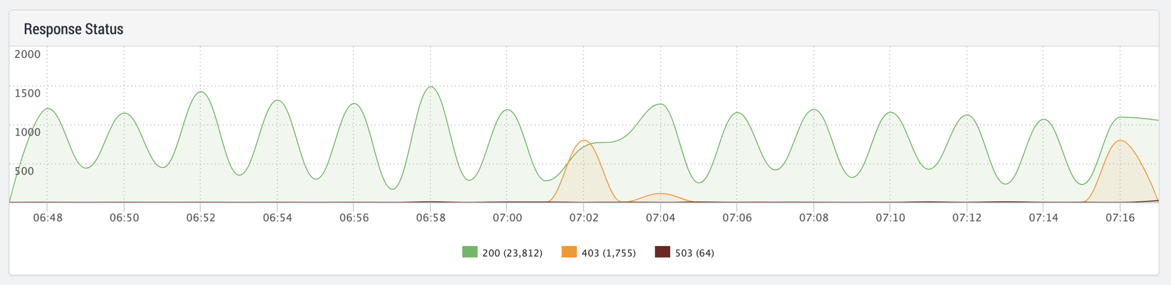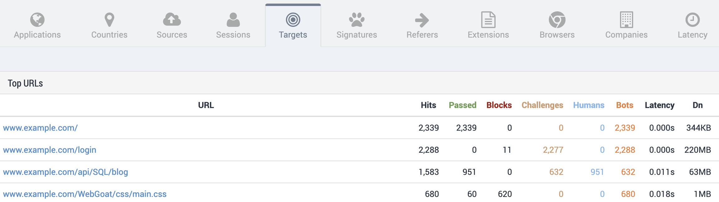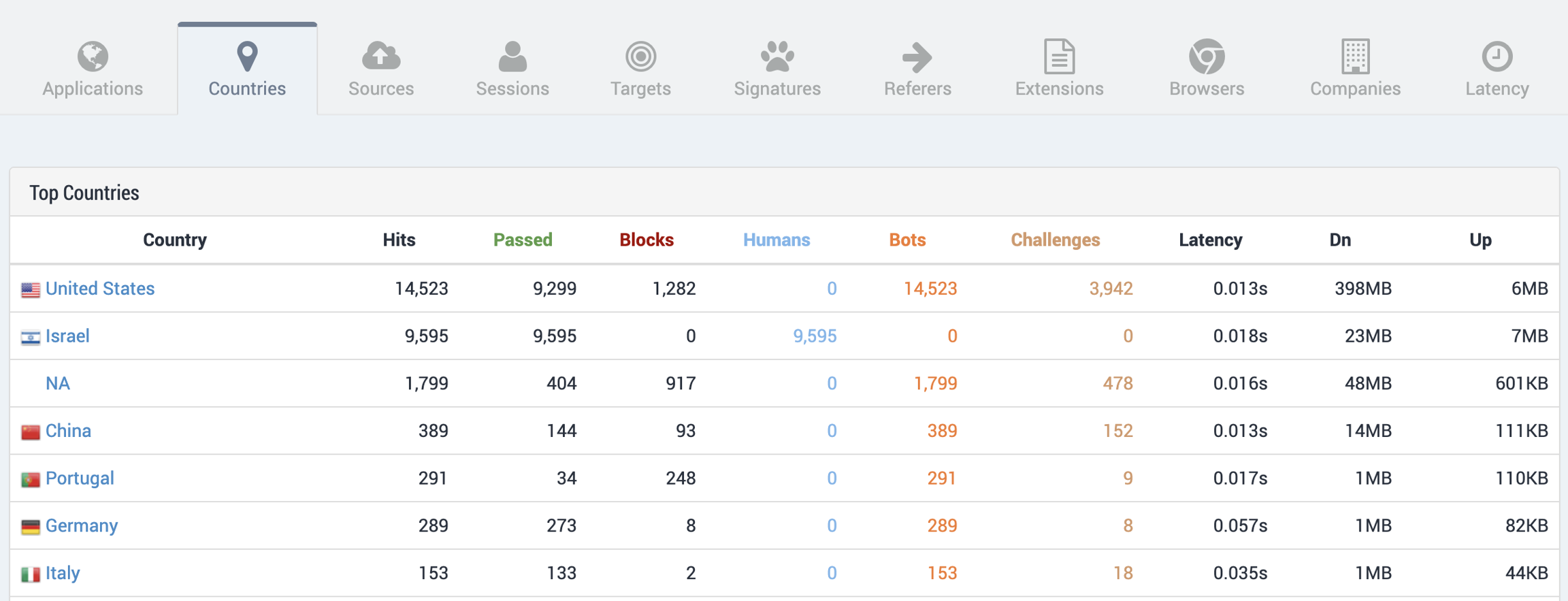 In many of these displays, entries contain links. Clicking on them will open the traffic log, filtered to show the item you selected. For example, in the "Top Countries" view, clicking on a country name will open the traffic log to display the most recent requests originating from that country.