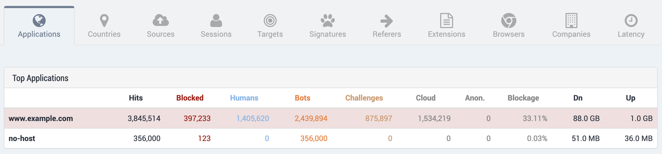 Shows all protected sites for the current Reblaze deployment. Applications marked in red have a blockage rate above 30%. The blockage rate is the ratio of requests blocked by the system to the number of total network requests.