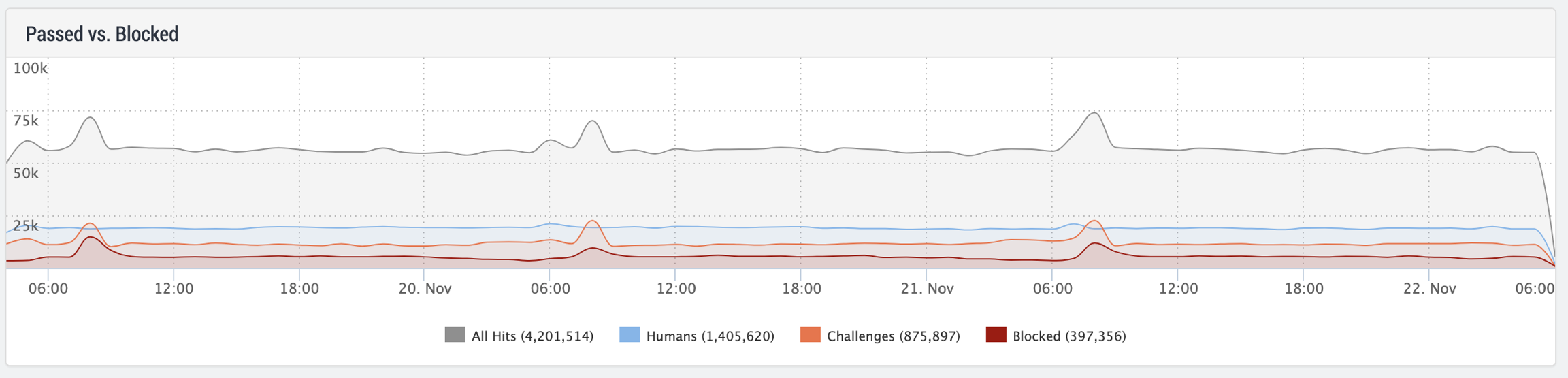 This section shows the traffic that was processed by Reblaze: requests which passed through to the upstream servers, and requests that were blocked. Hits are distributed by time and sorted into three different categories: Humans, Challenges, and Blocked. As you can see in the example below, the data is shown in different colors to easily distinguish among the categories.