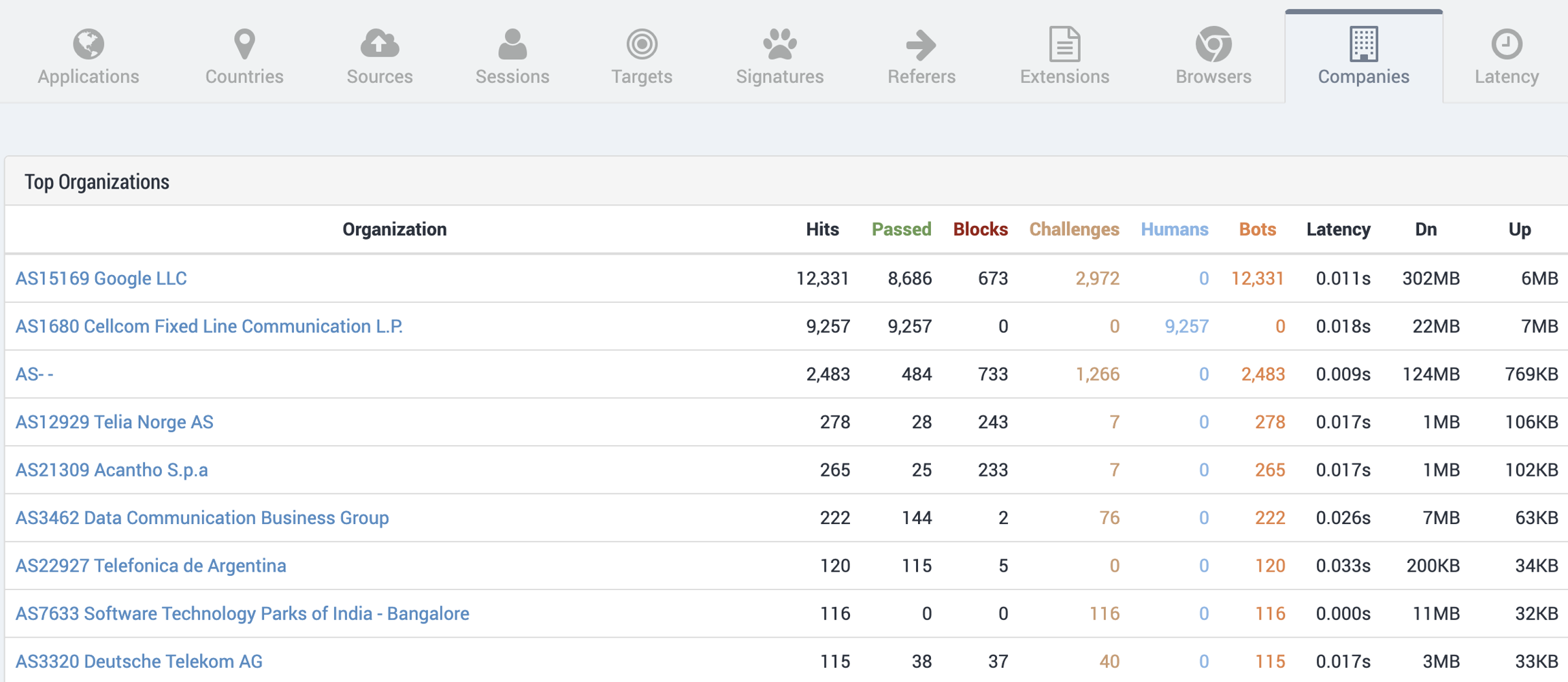 Shows all of the ASNs (Autonomous System Numbers) from which requests were sent. The ASN can identify individual entities, or larger networks: for example, a telecom provider or a cloud provider.