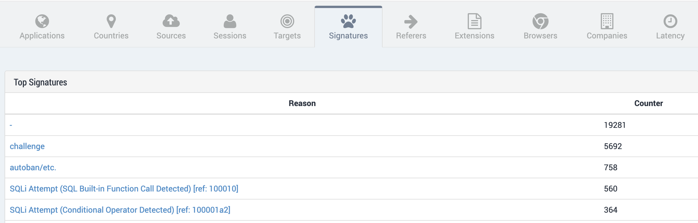 Shows the reasons that traffic was blocked. Unlike other displays, this section does not include hits, passed, blocked, etc.—the counter only shows the number of blocks per signature. Here you can see which types of attacks are most common in your environment. In the example screenshot below, the first entry is "-": this shows requests that were blocked, but not by Reblaze (i.e., they were blocked "by origin"—by the upstream server).