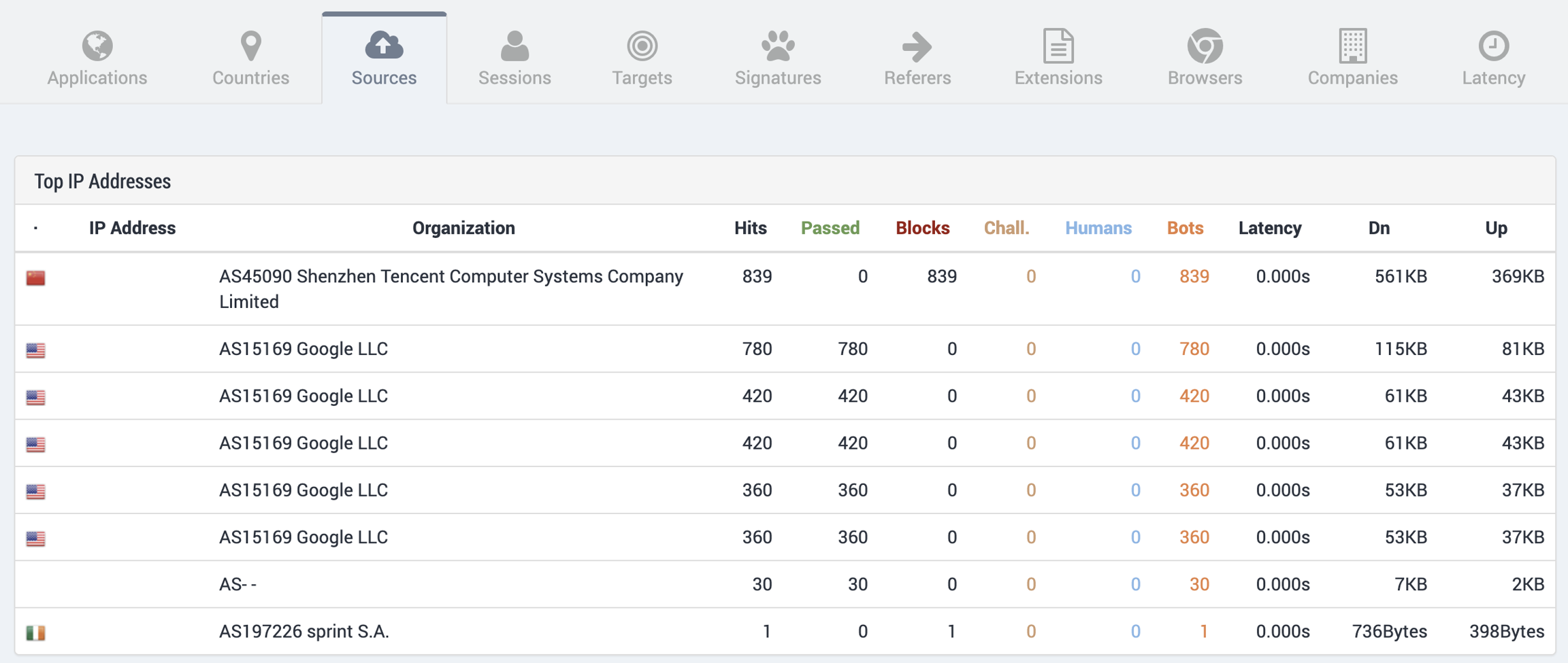 Shows traffic data according to IP address. The ASN (autonomous system number) for each IP is also shown.