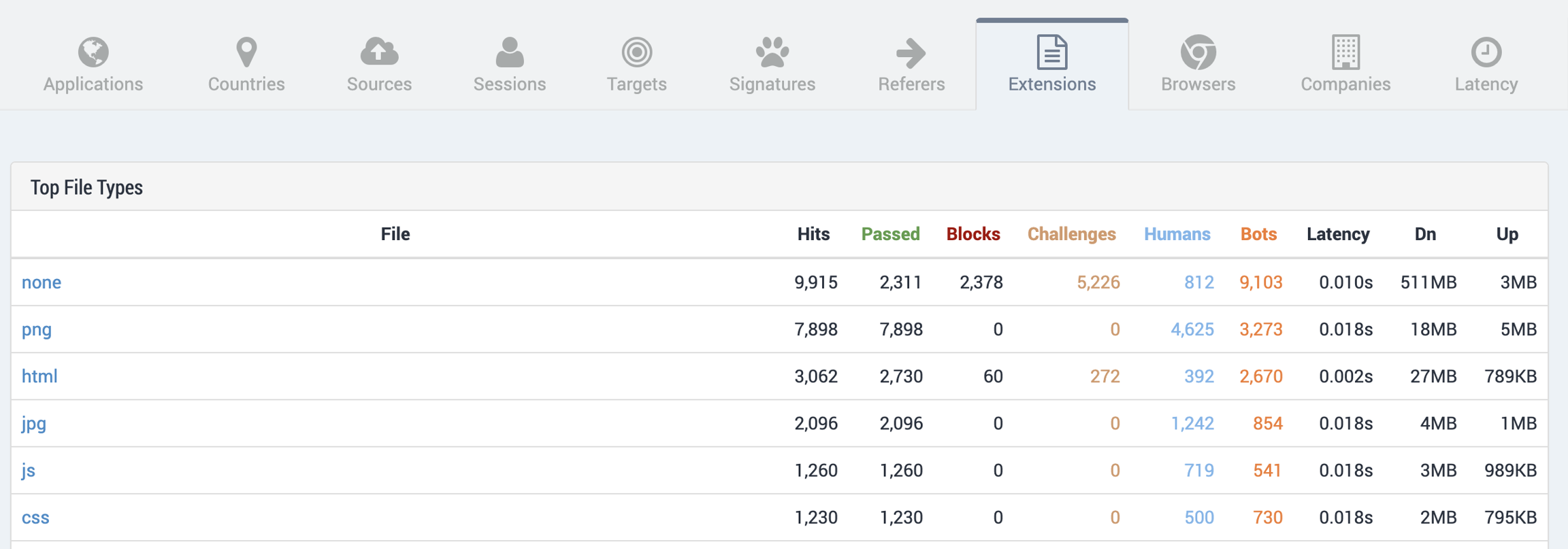 Allows you to view the various file types that are being used by the application. ("None" shows the network requests that weren't counted as file extensions.)