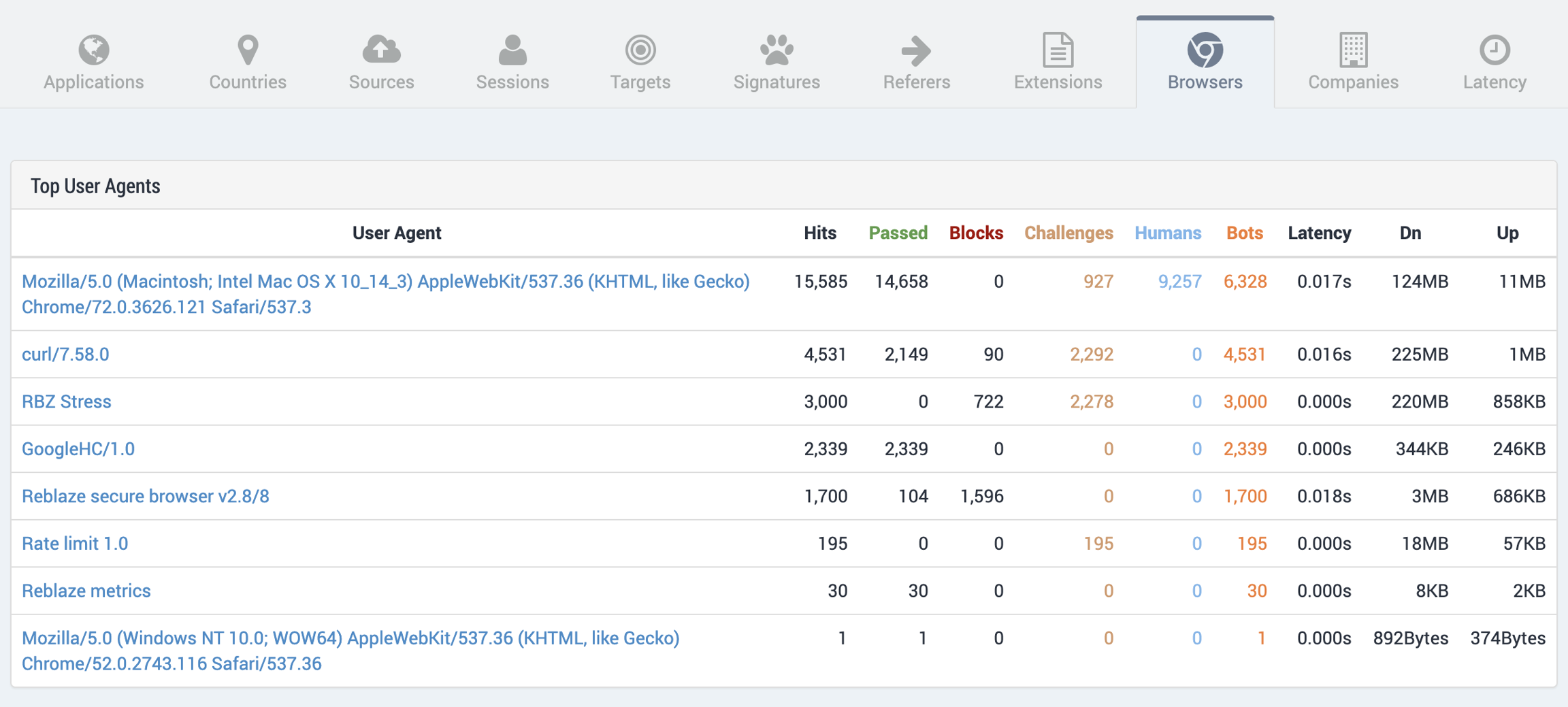 Shows the nature of user sessions. Sessions that pass Reblaze's bot mitigation challenge are identified as originating from humans, and are listed here according to the user's RBZ (Reblaze) cookie ID. In the screenshot below, note that the first line shows "-" for the ID. These are sessions that did not pass the challenge.
