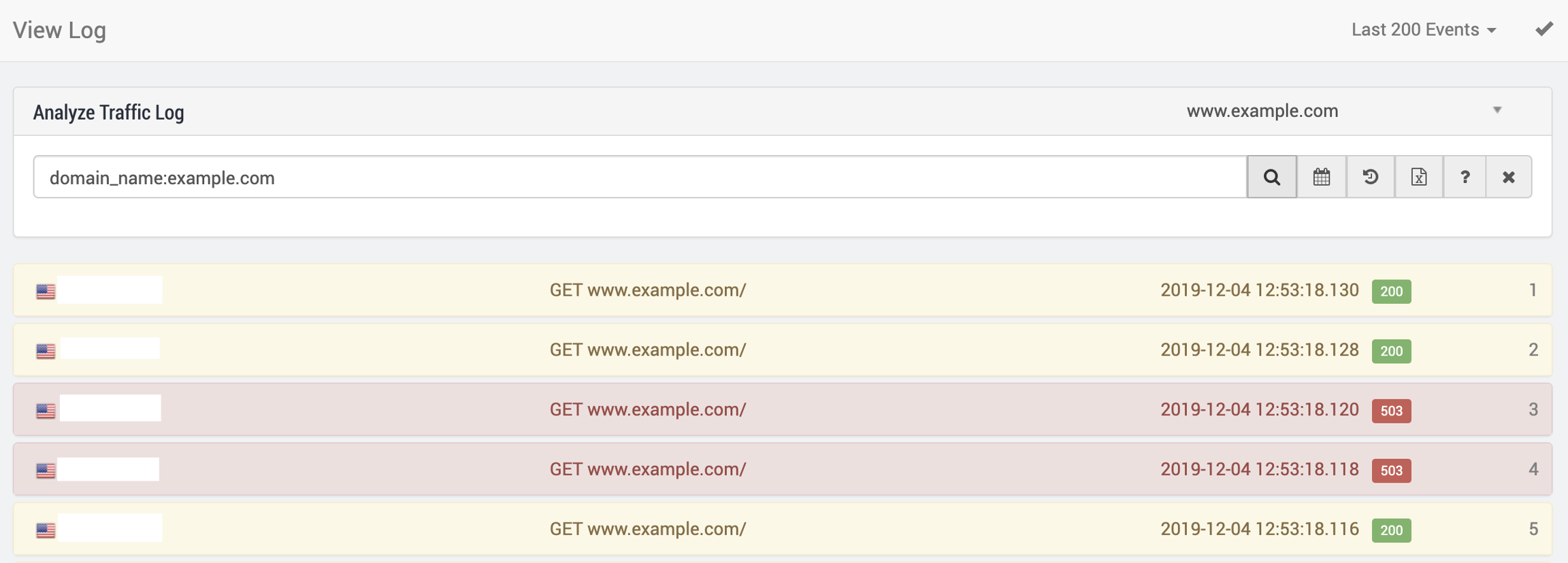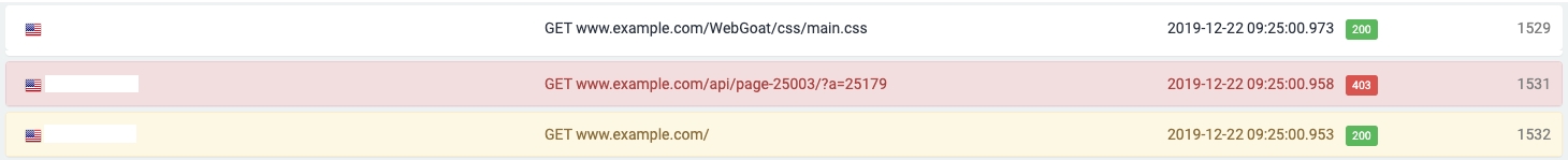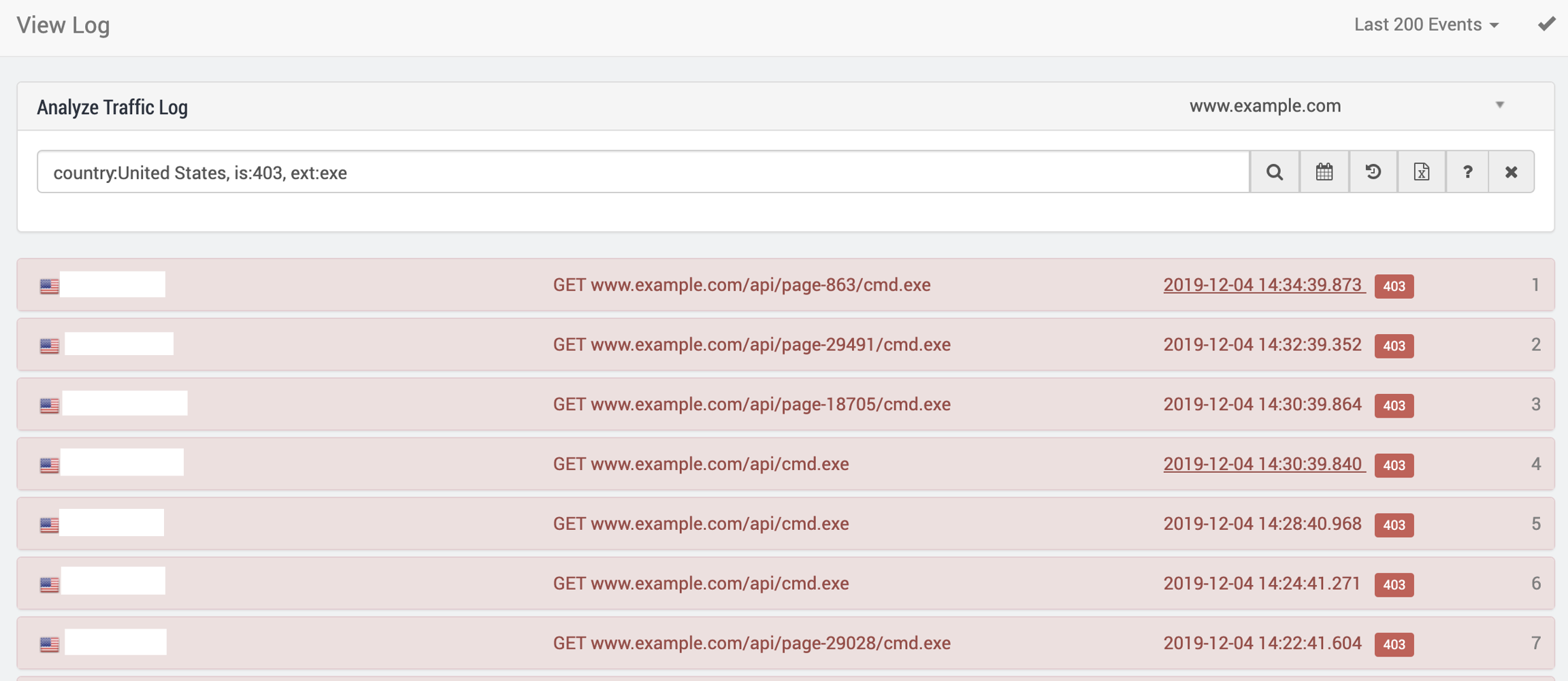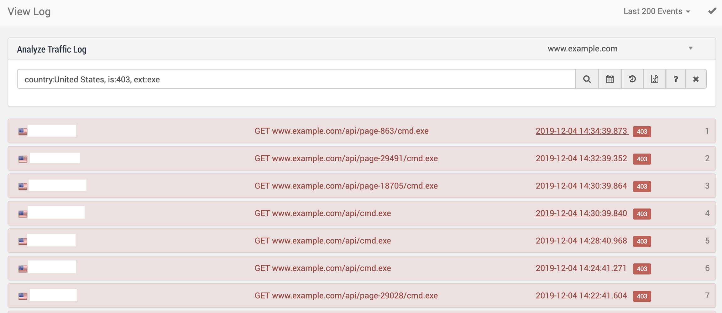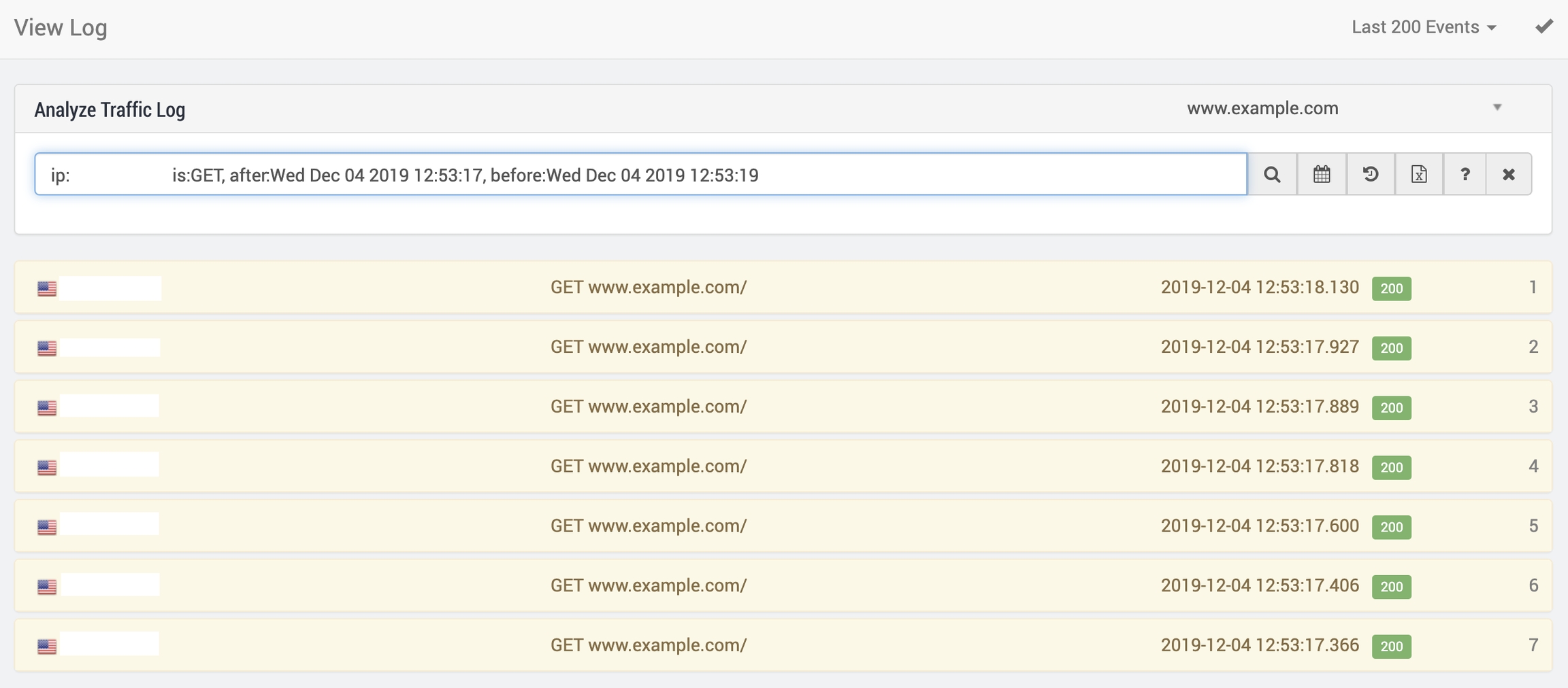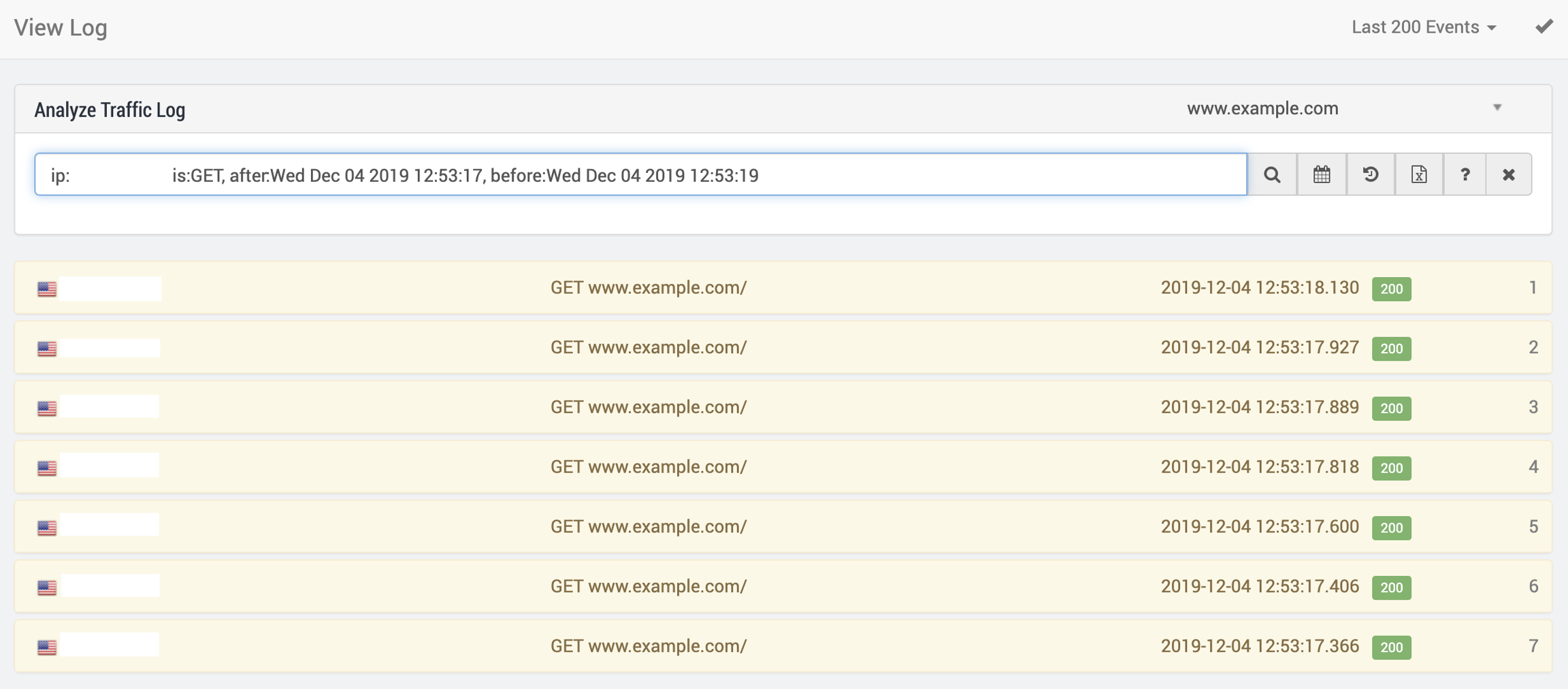 This page provides the ability to review and analyze the most recent traffic, up to and including real time. At first glance, you'll see the origin country, IP address, HTTP message type, the targeted location, time stamp, and status code.