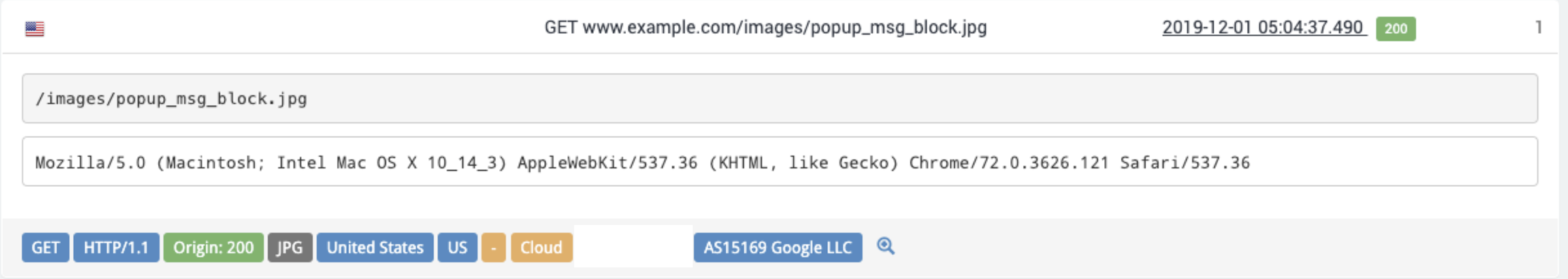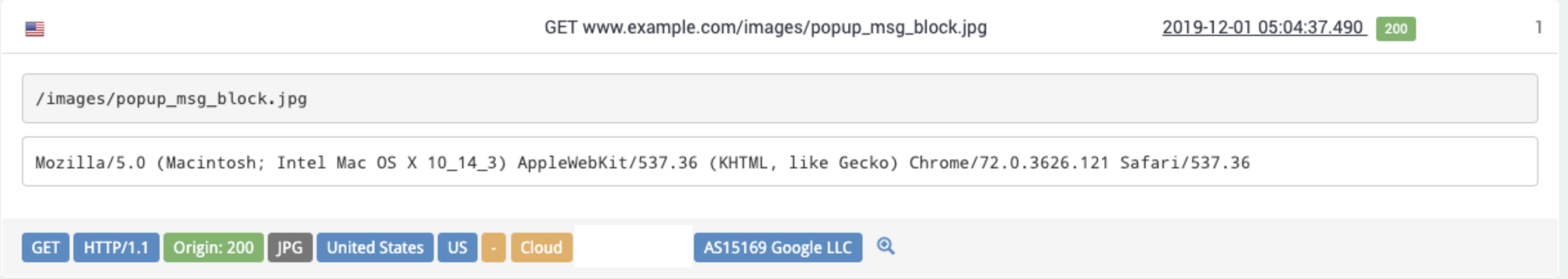 IP Classification: Whether the requestor is using an IP from a cloud provider, VPN, TOR, etc. In the example above, the requestor is using a cloud provider. Note that this does not indicate that the request was blocked for this reason. If the current Profile had included an ACL to block cloud users, then the Block reason would say "acl:cloud", and then this "Cloud" notification would appear after it for the IP Classification.