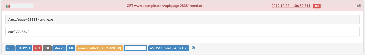 The above screenshot shows a log entry for a request that was blocked. Note that the Block reason is "Generic Attack [ref 22400000]". The "ref" number is a Reblaze Signature reference ID.