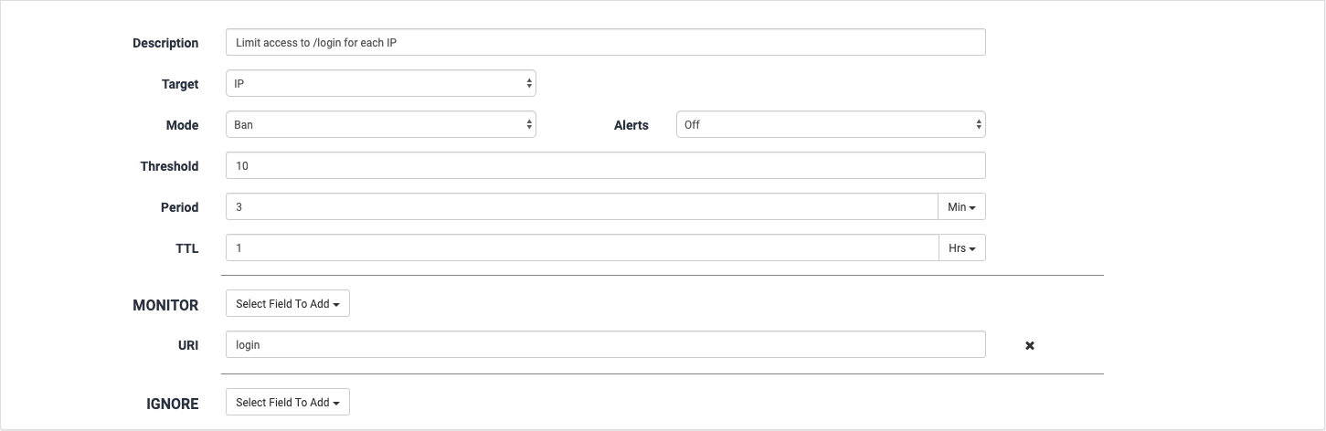In the example below, this Dynamic Rule limits the number of requests that are sent to /login from a specific IP.