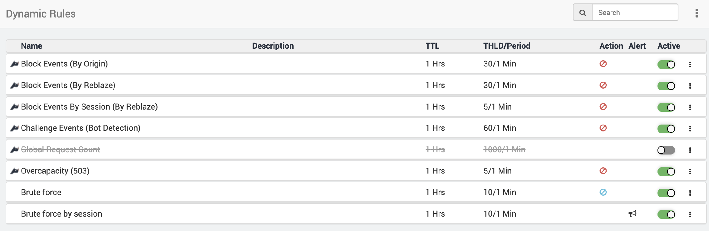 The interface displays the Dynamic Rules that are currently defined. At the top are the default rules supplied by Reblaze, marked with the Reblaze icon.