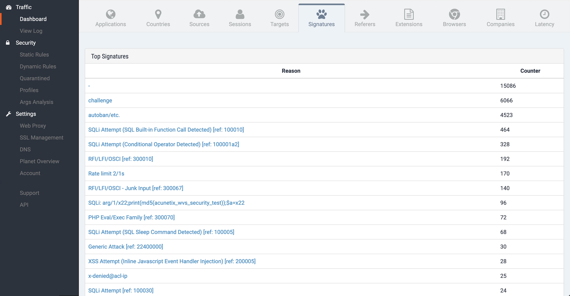 There are several ways to obtain values for constructing Block Reasons. The first is the list of standard Reblaze WAF signatures (example: Autoban/etc.). Other possible values are custom, created dynamically by Reblaze as the result of user configuration. Example: Rate limit 2/1s .