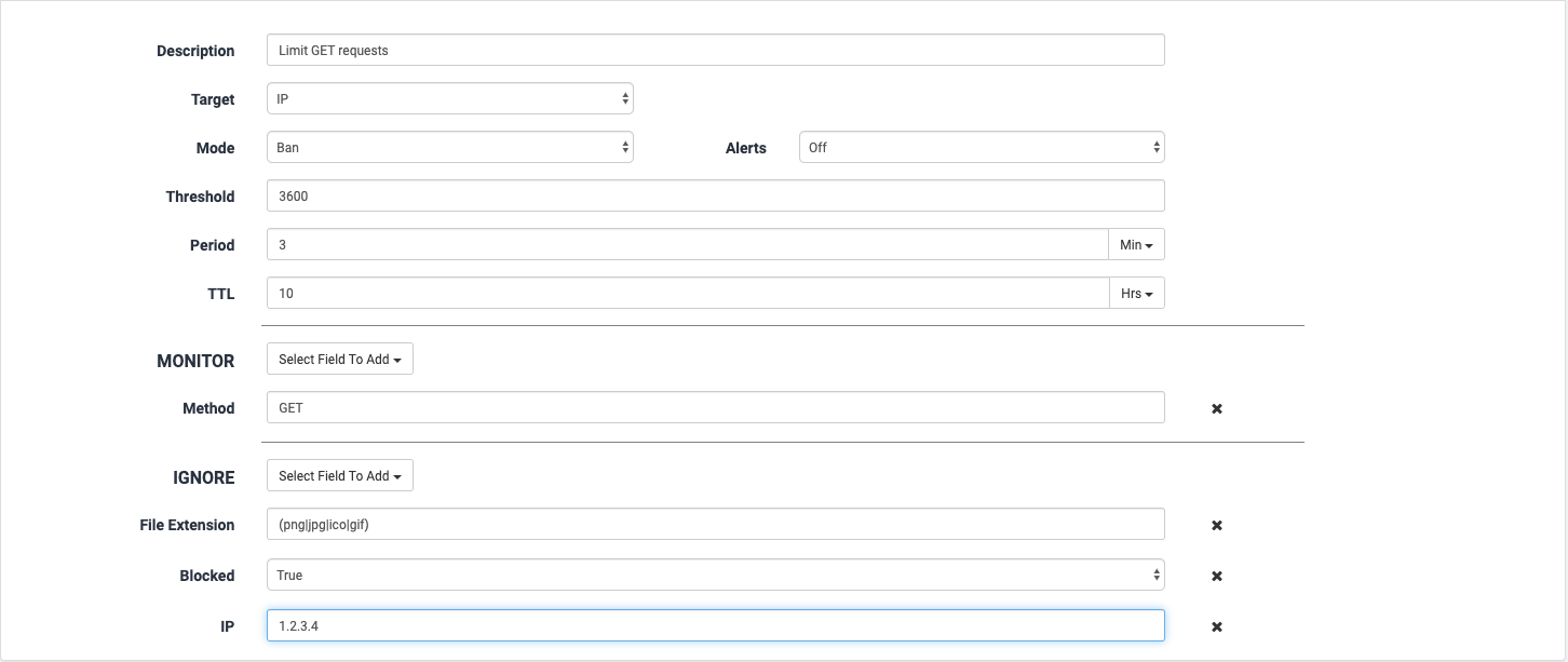 This rule blocks HTTP GET requests from a specific IP for 10 hours, under these conditions: