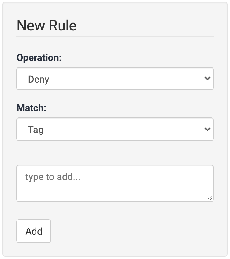 Each ACL contains one or more Rules. These are listed in the middle of the screen. To create a new Rule and add it to the current ACL, use the settings on the right part of the screen. (See below for more on this.) When you are finished with the Rule setup, click on the Add button. The Rule will be added to the Policy that you are currently defining or editing.