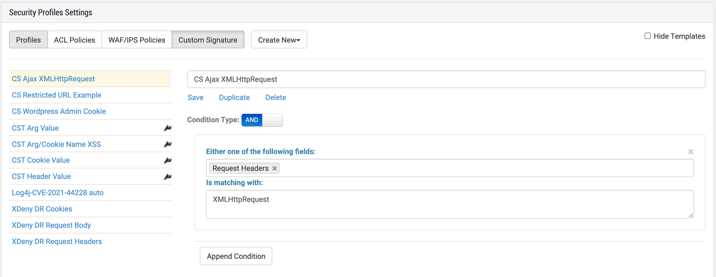 There are several Reblaze-maintained Custom Signatures which are templates (designated by the prefix CST). If you do not wish to see them on this page, they can be hidden by selecting the Hide Templates checkbox on the upper right. These templates are used by the Create New Site wizard, and can also be assigned to ACL Policies.