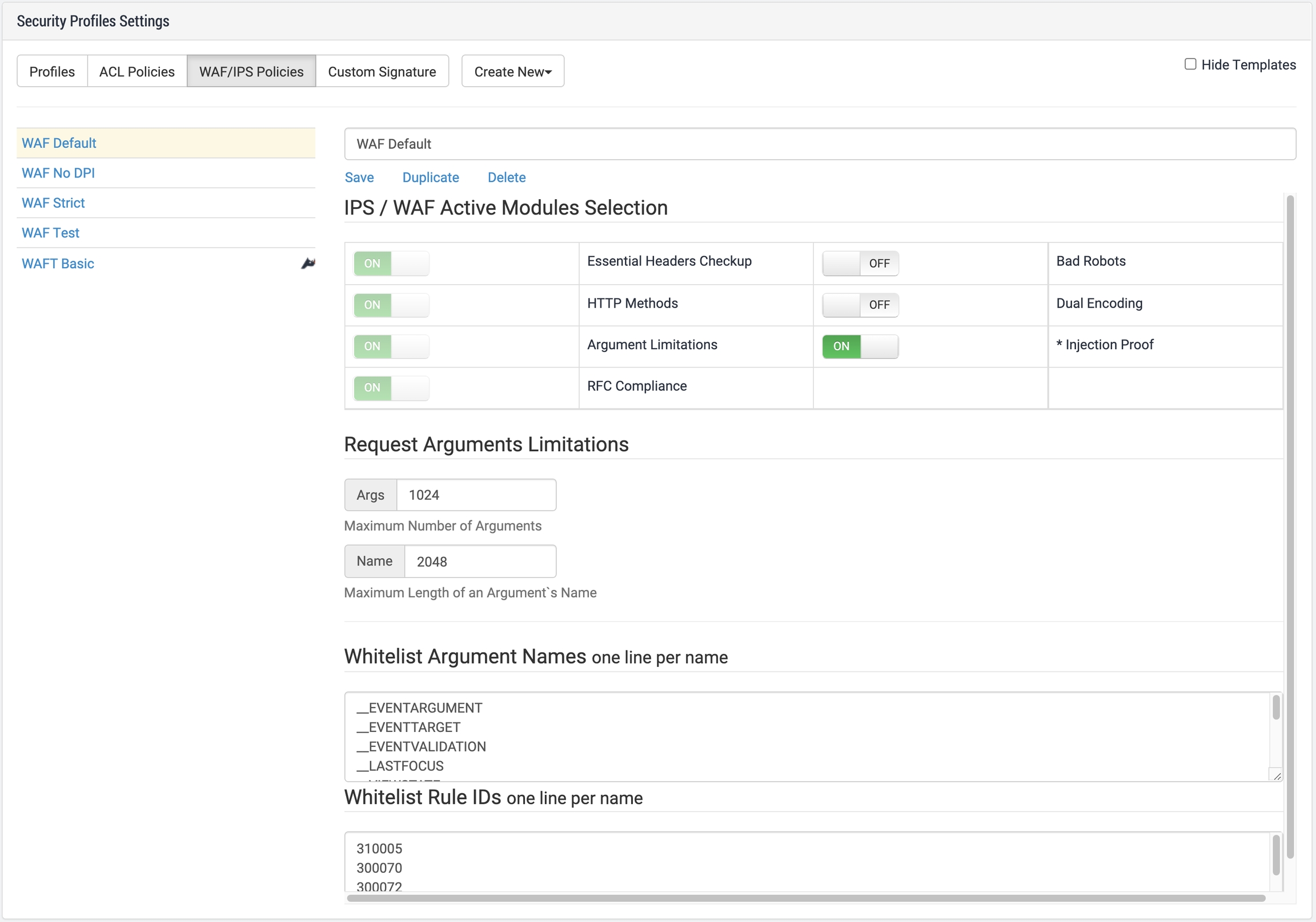 To create a WAF/IPS Policy, select an existing one and choose Duplicate, then edit the newly-created copy.