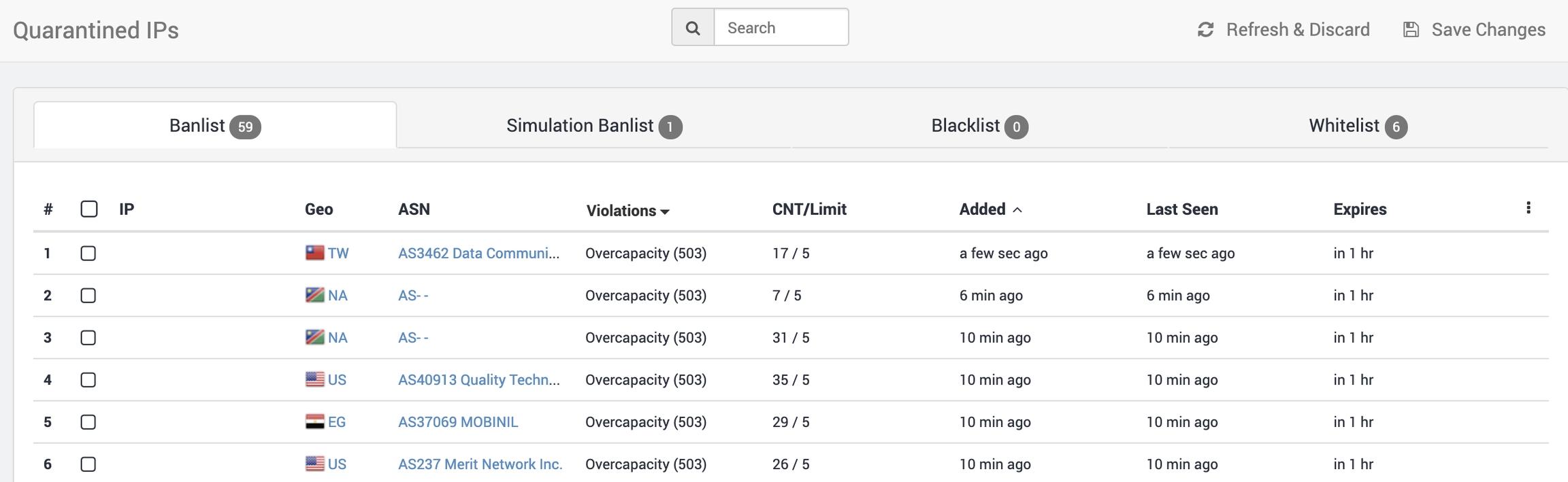 For each entry, it's possible to see the following: IP address, origin country, AS number, the violation that was triggered, "CNT/Limit" (the number of violations compared to the allowable limit), when the ban began, and when the ban will expire.