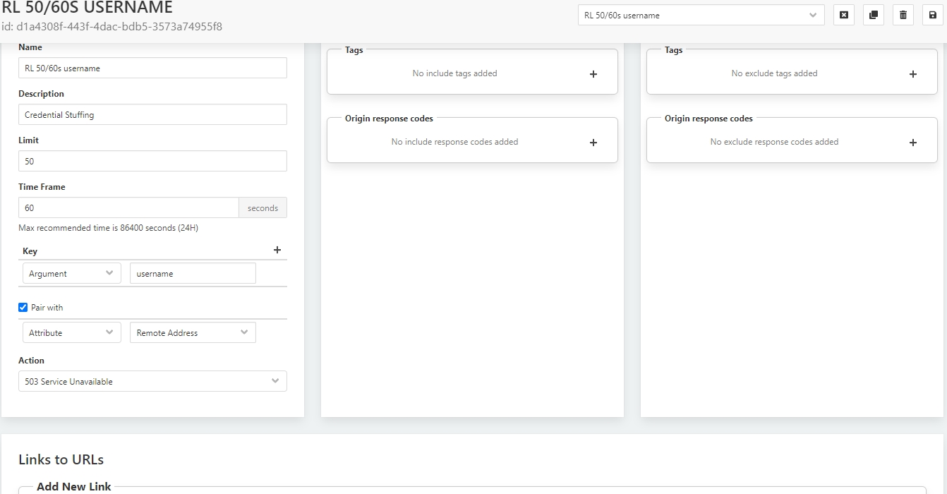 After defining a new Rate Limit, select the Save button at the top of the window. An additional section (Links to URLs) will then appear at the bottom of the window. This will be discussed later.