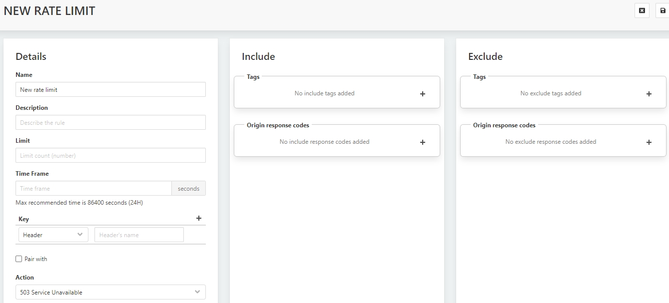By default, an active Rate Limit Rule will be enforced upon all incoming requests. Specifying an Include and/or an Exclude filter will set limits to this enforcement.