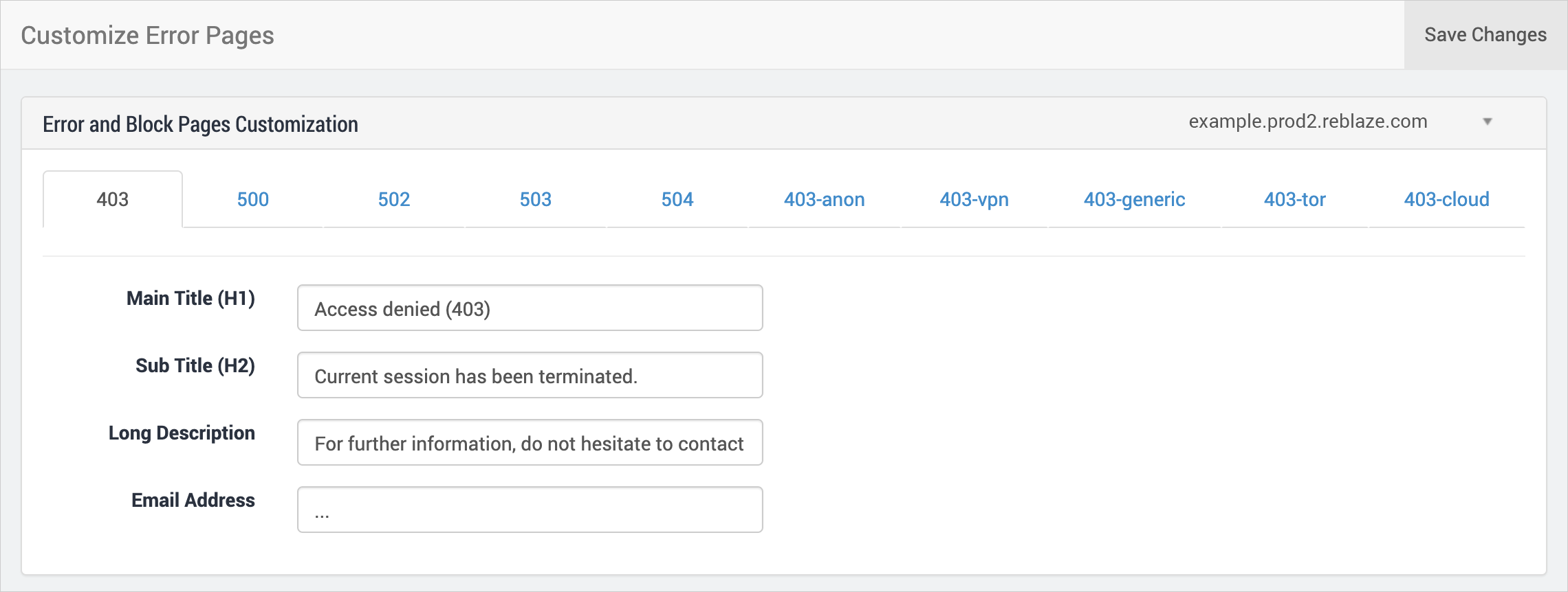 This section allows you to customize the error messages that are displayed to users. There are separate tabs for the most common types of errors, with the HTTP status code for each one. The defaults can be used, or you can customize the content and/or contact details as needed.