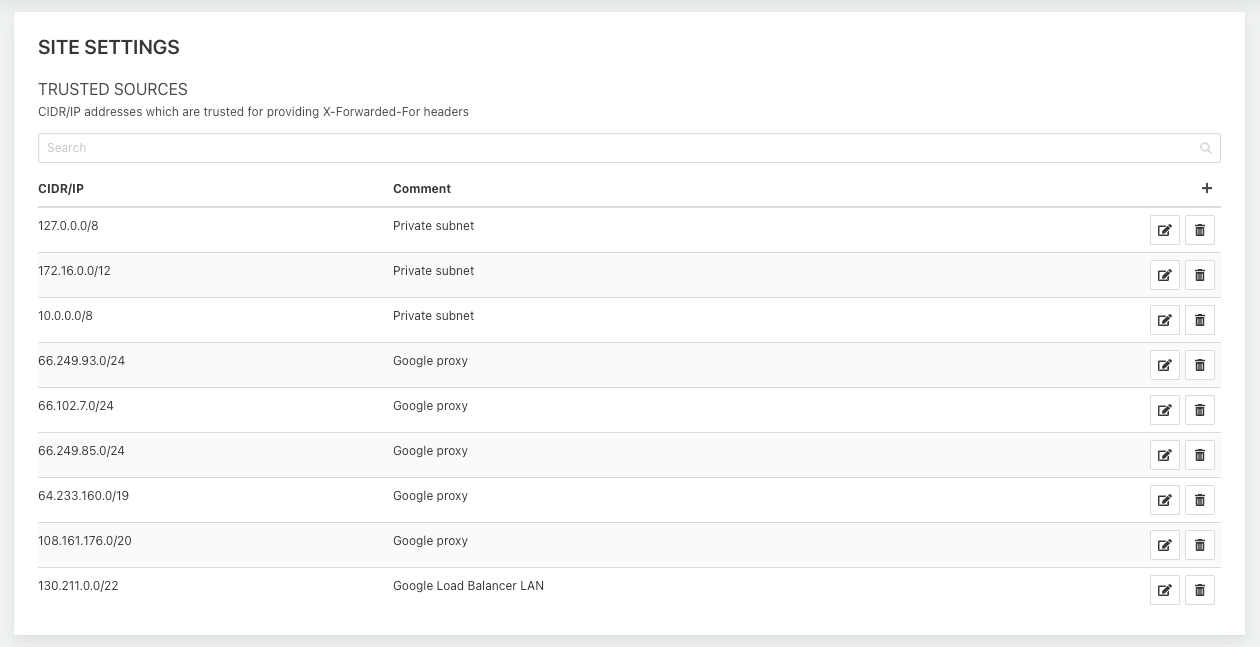 The ranges of IP addresses which are trusted for providing forwarded IP addresses: for example, the load balancers in front of Reblaze, or the CDN.