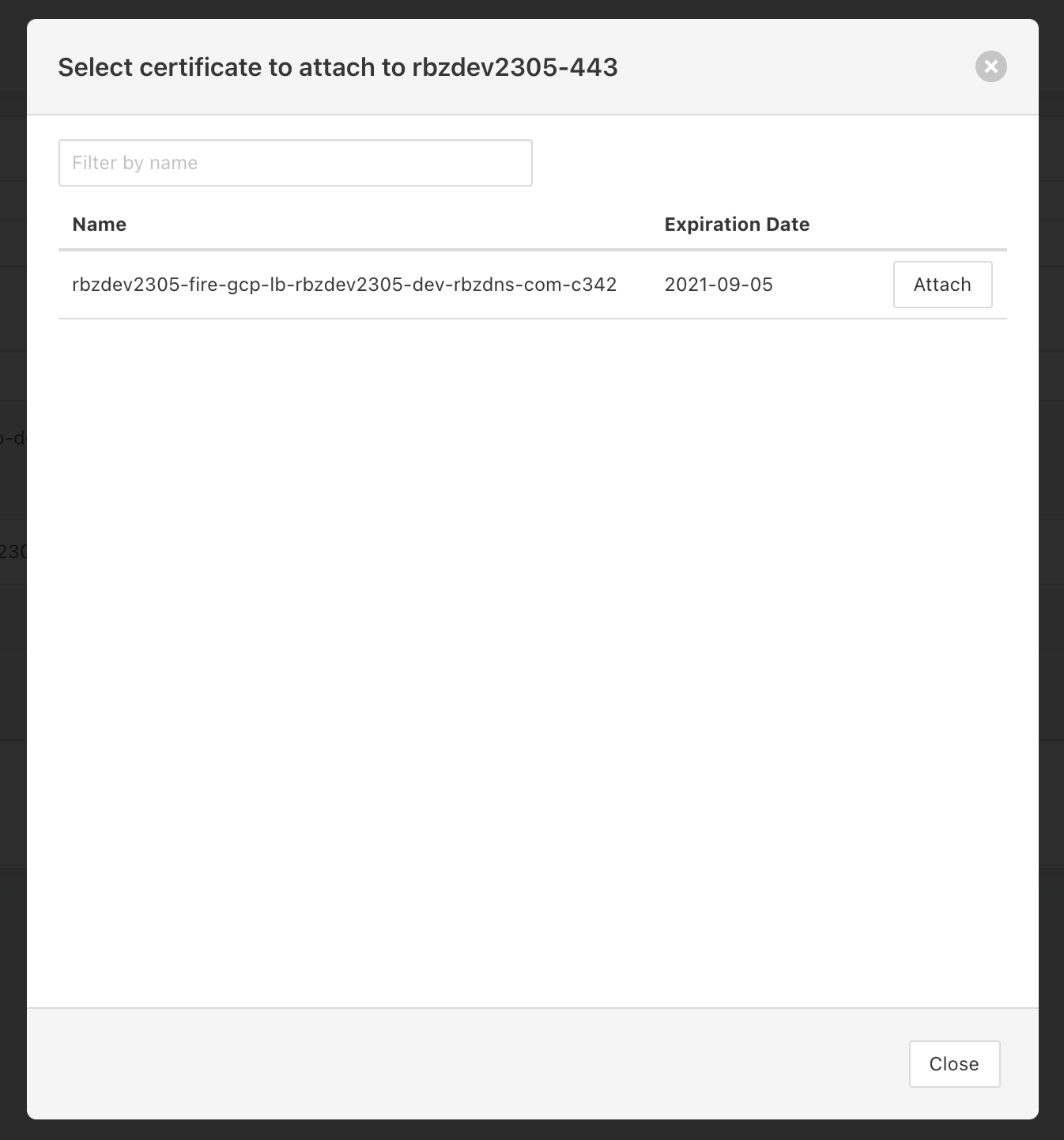 To attach a certificate, select the Attach certificate button. This will open a modal window with a list of unattached certificates from the certificate store: