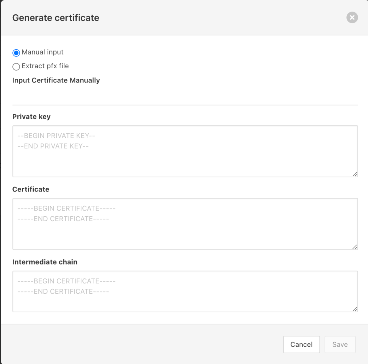 To upload a PFX file, select "Extract pfx file." Otherwise, enter the Private Key, Certificate body and Intermediate chain values into their respective text boxes.