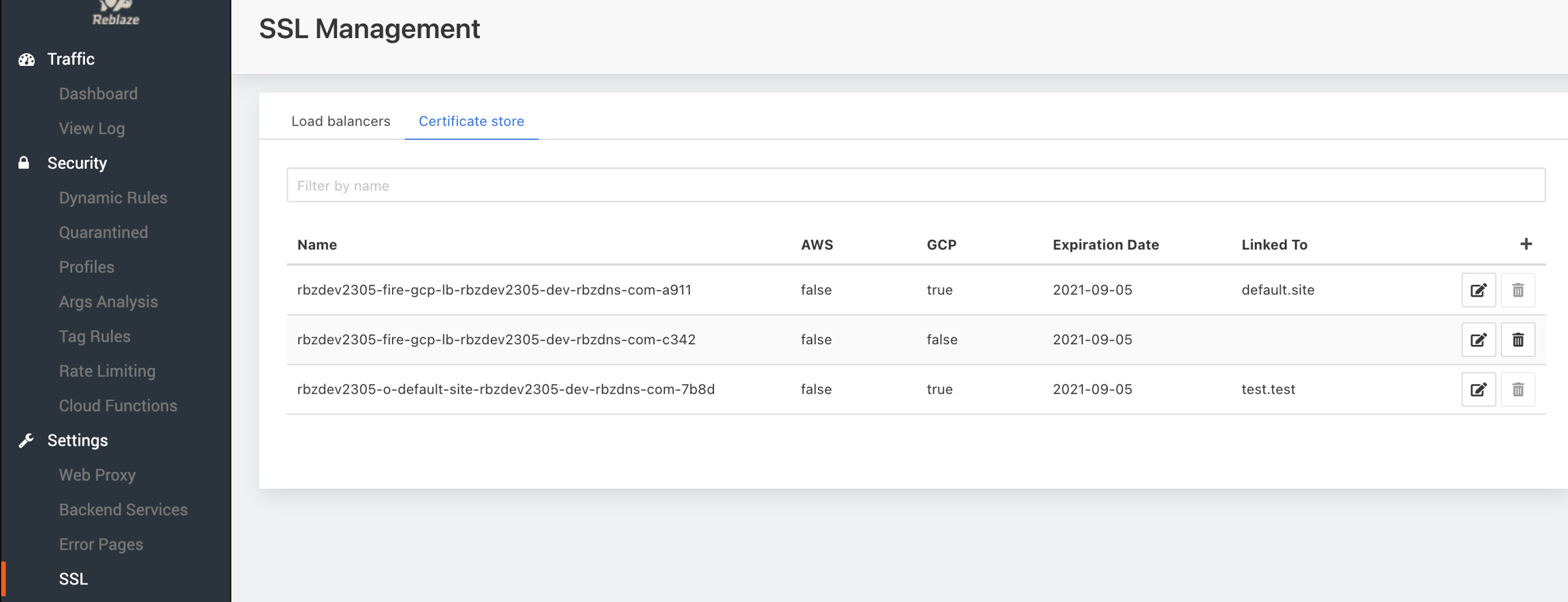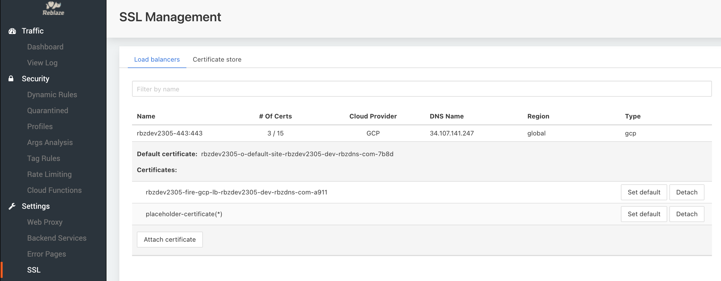 This section allows you to manage your SSL Certificates. You can create, edit, attach, and remove certificates. The certificates themselves can be uploaded and stored into Reblaze's cloud, or a cloud load balancer.