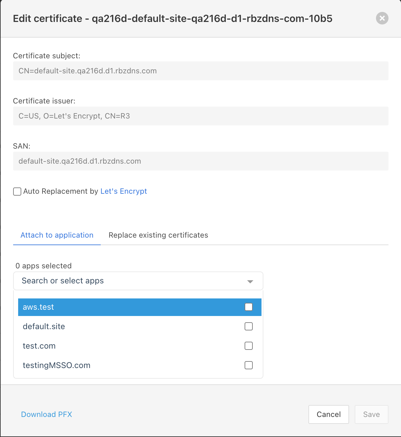 Replace existing certificates - When this is chosen, a "Select Certificate" dropdown list will appear. Selecting one and then clicking "Save" will result in all sites/applications being transferred from the selected certificate over to the certificate you're currently editing.