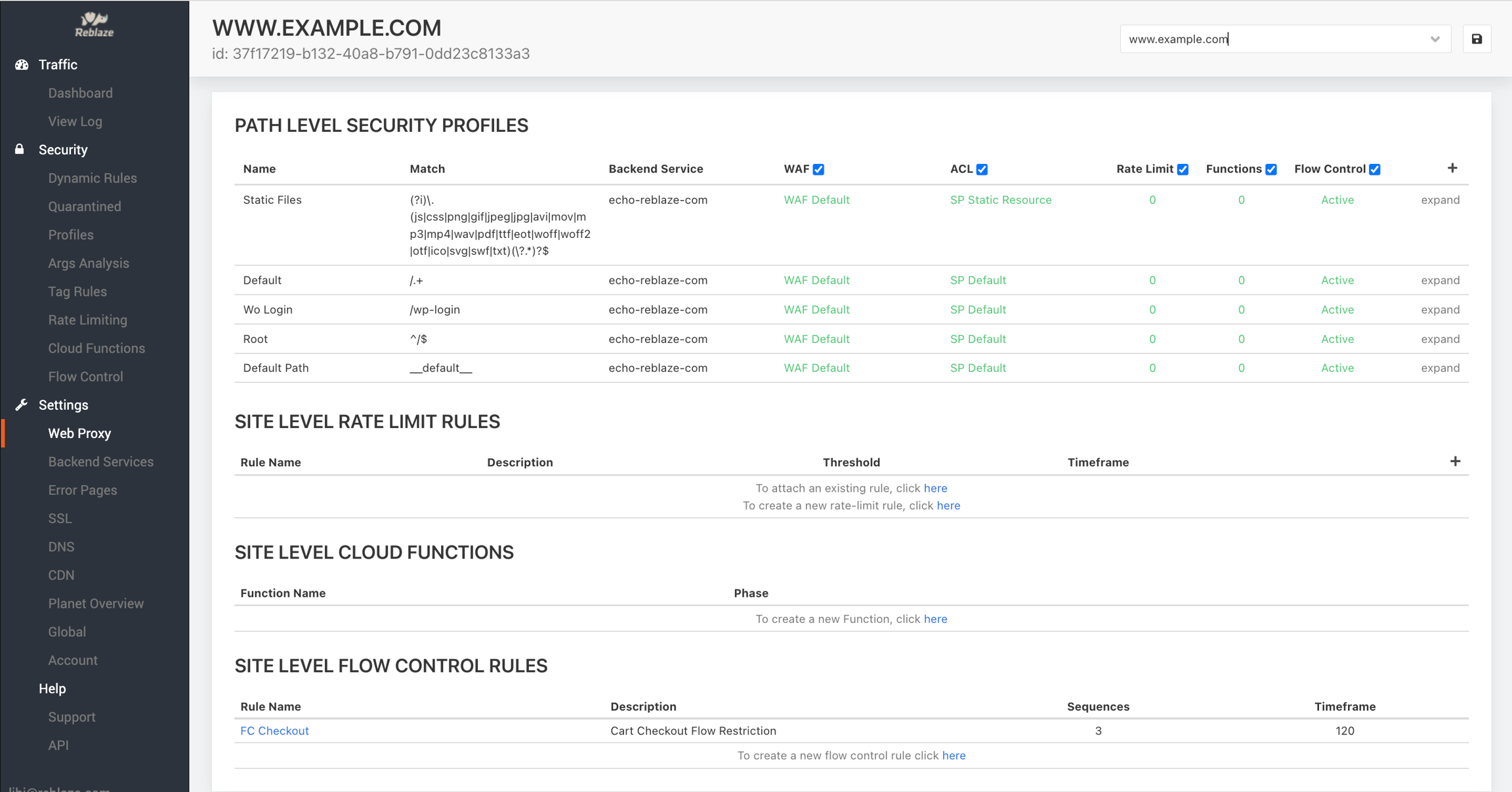The Web Proxy page allows you to edit an existing web application. To define a new web application within Reblaze, navigate to the Planet Overview page.