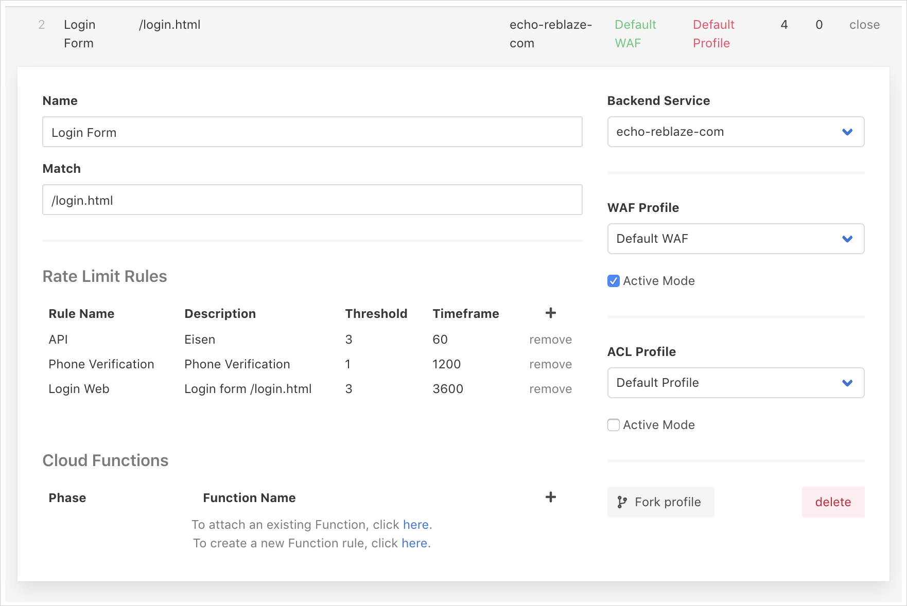 Some rulesets are defined within the Security section of the interface: the ACL Profiles, WAF Policies, Rate Limiting, and Cloud Functions. Others are defined farther down on this page, such as the Request Rate Limits discussed below.