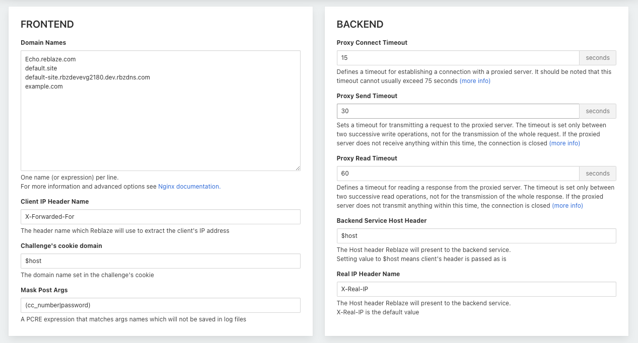 This section (shown above in the previous screenshot) configures Reblaze's communication with the backend.
