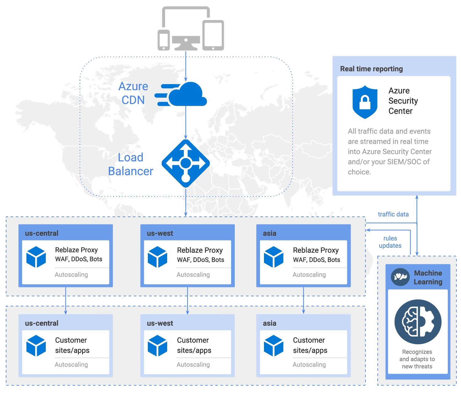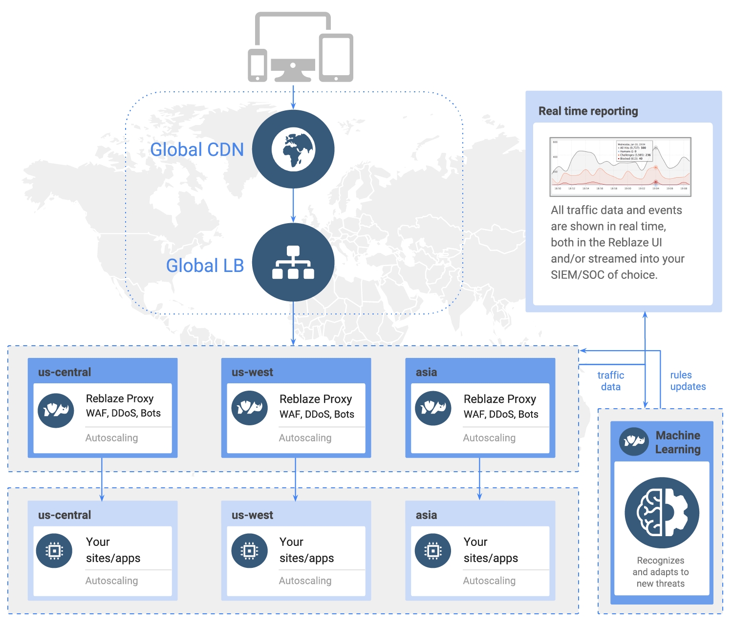 Reblaze deploys as a reverse proxy, geolocated immediately in front of the protected network for minimal latency. As incoming traffic passes through Reblaze, attack traffic is blocked and denied access. The platform's overall architecture is as follows: