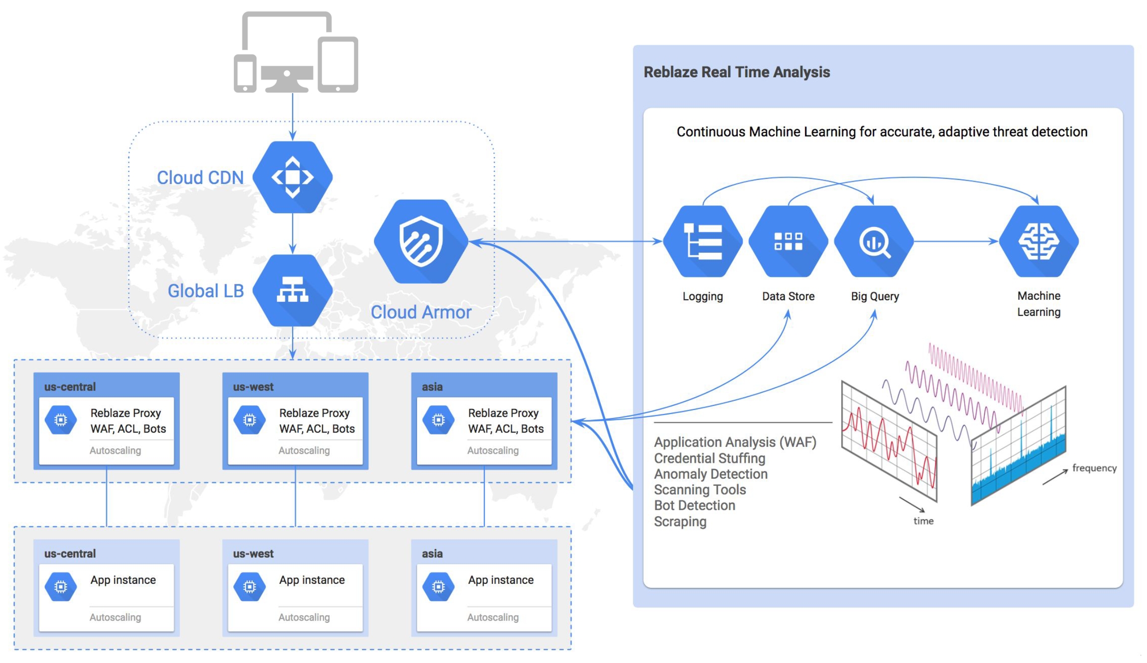 Requests are routed through the Auto Scaled instance group of "Reblazers" (security logic units) that will inspect the traffic, and according to their security policies, will bypass, deny, or allow the requests. Rule updates are sent to Cloud Armor, which blocks hostile traffic at the edges.