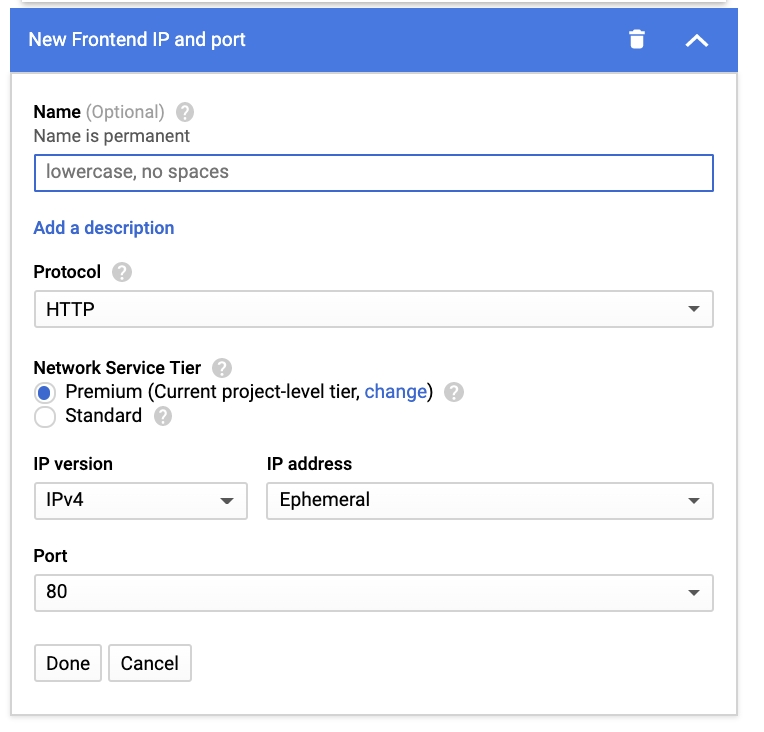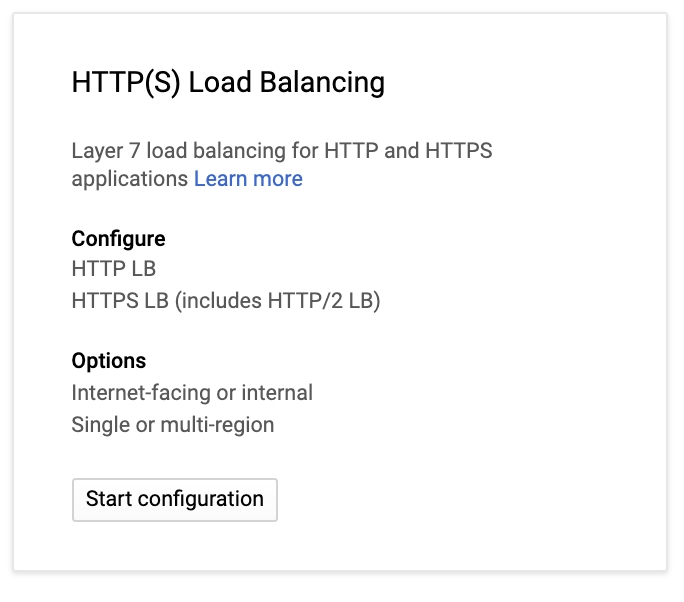 For most most use cases, you will need to set up two load balancers, one for HTTP and one for HTTPS. The following steps assume that you will be setting up two load balancers. Therefore, the processes described here will be done twice, with some addition steps for HTTPS. The differences between the setup for the HTTP LB and the setup for the HTTPs LB will be noted.