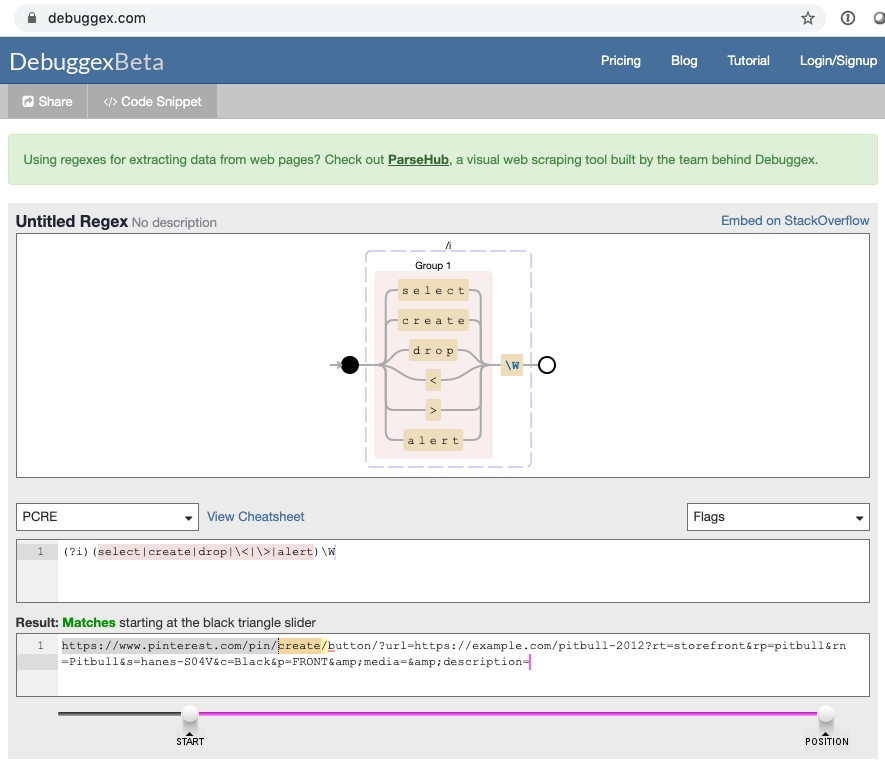 We see that the expression that was meant to identify an SQL command of CREATE, is also matching with the URL generated by a user who was trying to feature this site's product on Pinterest.
