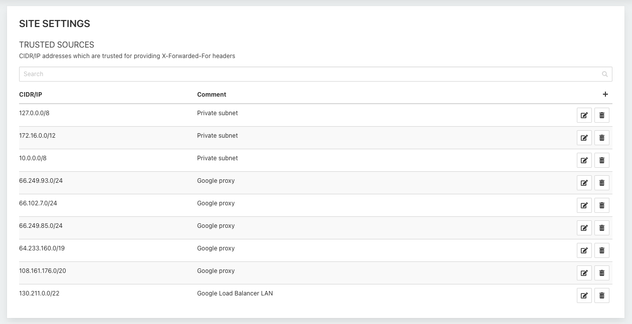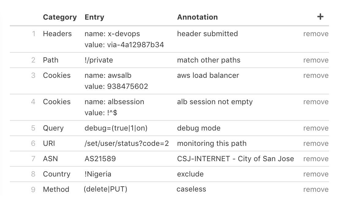 Defines one or more header fields within which Reblaze can find the client's IP address. When Reblaze receives an incoming request from a client, the request will have passed through a load balancer on its way to Reblaze. This means that the header will contain the client's IP and the load-balancer IP. These two IPs are usually found within the X-Forwarded-For field (which is the default entry here). In this situation, Reblaze knows how to extract the client IP from this field. In other situations, a different field name might be necessary. For example, if the Reblaze customer is using Akamai CDN, the incoming request will have the client IP in a field named True-Client-IP instead.
