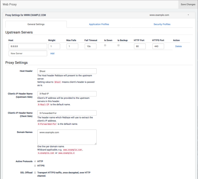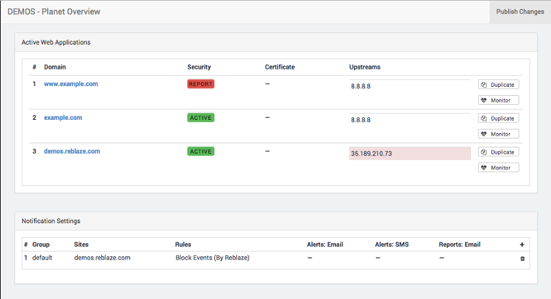 Note: the deployment will not occur until you click "Publish Changes." In general, whenever you work within the Reblaze interface, saving and publishing is always necessary. More information is here: Saving and Publishing Changes.